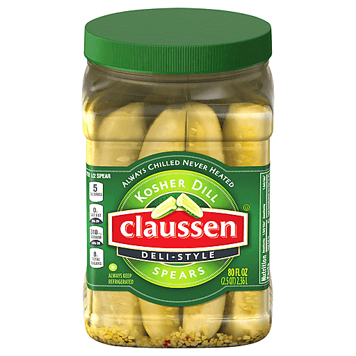 Add a sweet and juicy crunch to your summer with Claussen Deli-Style Kosher Dill Pickle Spears. Our Claussen deli-style pickle spears are crafted with fresh cucumbers picked straight from the vine and refrigerated for our classic Claussen crunch. Pickled with a unique spice blend of turmeric, garlic and red pepper, our deli-style dill pickle spears are great served on the side with your burgers, hot dogs and sandwiches. Claussen pickles are vegan, Kosher Certified and a fat free food, making them a delicious snack. They also make a great addition to your charcuterie board. Claussen Deli-Style Kosher Dill Pickle Spears, the perfect choice for pickle enthusiasts seeking an authentic deli experience. These premium pickle spears are handcrafted with care, delivering exceptional flavor and texture that will leave your taste buds craving more. Made with the finest ingredients, Claussen Deli-Style Kosher Dill Pickle Spears are crafted using a traditional recipe that has been perfected over time. Each spear is carefully selected to ensure optimal crispness and firmness, providing a satisfying crunch with every bite. These pickles are brined in a tangy blend of kosher dill, garlic, and spices, resulting in a bold and robust flavor profile that is sure to please. What sets Claussen apart is their commitment to quality. Unlike many other pickles on the market, Claussen pickles are never cooked, preserving their fresh taste and crunchy texture. These pickles are refrigerated from the moment they are packed, maintaining their natural crunchiness and delivering a truly authentic deli-style experience. Whether you're enjoying them straight from the jar, adding them to sandwiches or using them to complement your favorite recipes, Claussen Deli-Style Kosher Dill Pickle Spears are the perfect choice. Their distinct flavor and superior quality make them a must-have for pickle lovers and a versatile ingredient for your culinary creations. Indulge in the unmistakable taste of Claussen Deli-Style Kosher Dill Pickle Spears today and elevate your pickle experience to new heights. With their superior flavor, crispness, and commitment to quality, Claussen pickles are the epitome of excellence in every bite. Keep our 80-ounce resealable jar of deli-style pickle spears refrigerated. Whether you enjoy pickle chips or spears, slices or wholes, you can't beat Claussen's mouthwatering crunch.