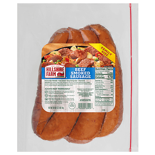 Hillshire Farm Beef Smoked Sausage is a delicious answer to weeknight family dinners. Handcrafted with natural spices and only our finest cuts of meat, this beef sausage features rich, bold flavor in every bite. Simply heat this fully cooked sausage on the stovetop or the grill for easy appetizers or meals. Hillshire Farm beef sausages help create family dinners ready to eat in minutes.
