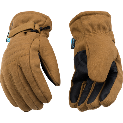 Brown water-repellent heavy duck canvas fabric shell, which is laminated to a foam lining, protects hands from cold & wet conditions, Black durable PVC water-resistant gripping material on palm & thumb help withstand wear in high-abrasion applications, prevents slippage, & avoids base material failure, Easy-On™ cuff with shirred elastic wrist facilitates quick on & off use, while tightening the shell material to the hand for a secure fit & providing an additional preventative measure to block debris from further entering the glove, Adjustable hook & loop pull-strap wrist provides a custom fit, Turned fabric hem is a simple rolled hem that creates a finished look & helps prevent fraying, Flexible, ribbed foam padded knuckle strap & back-of-hand protects against bumps & abrasions, Fourchette finger design allows for the natural extension & contraction of finger movement, Angled wing thumb design, which is seamless between the palm & thumb, offers additional flexibility & comfort, High-performance signature Heatkeep® thermal insulation, laminated to a soft TR2 inner lining, provides superior heat-retention by trapping heat, repelling the cold, & wicking away moisture, aquaNOT!® waterproof insert lines the entire interior of the glove to keep hands dry in wet conditions, Pairing hook keeps gloves together when not in use