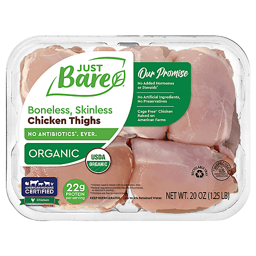 Our USDA Certified Organic Boneless, Skinless Chicken Thighs save you time and make for a delicious, savory protein at any meal. Great in the oven, on the grill, or in a skillet! As always, Just Bare® provides chicken that features no antibiotics, ever*. Has no added hormones or steroids†. Uses no artificial ingredients or preservatives and uses chickens raised cage free on American farms‡. *Chicken used is raised with no antibiotics ever, +Federal Regulations prohibit the use of hormones or steroids in poultry. ‡Chickens free to roam in barns.