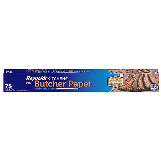 Reynolds Kitchens Pink Butcher Paper with Slide Cutter helps ensure your smoked brisket and pork turn out juicy and tender while retaining a crisp outer bark. Wrapping meats for the last stage of smoking seals in moisture and protects smoked meat from getting too dark or overly smoky. Breathable butcher paper allows steam to escape, which helps retain the hard earned, slightly crunchy exterior. This unbleached, unwaxed, 40lb pink butcher paper for smoking meat is FDA compliant, tested for temperatures up to 300°F and certified by the Sustainable Forestry Initiative. Perfect for smoking meat, Reynolds Kitchens Butcher Paper for smoking meat is strong when wet and resists leaks and tears. You’ll feel like a pit boss when you prep, wrap and serve your smoked feast like a barbecue pro on pink butcher paper. Also great for wrapping gifts, creating signs and art projects.